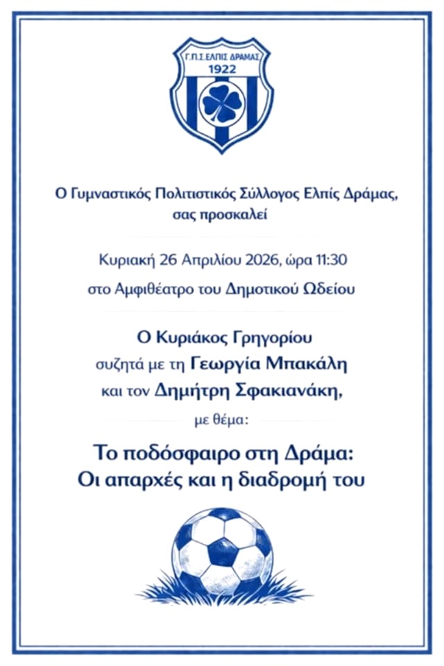 Ο νεοσύστατος “Γυμναστικός Πολιτιστικός Σύλλογος ΕΛΠΙΣ 1922”, σας προσκαλεί, την Κυριακή 26-4-2026, ώρα 11.30 , στο αμφιθέατρο του Δημοτικού Ωδείου Δράμας, στην συζήτηση με θέμα “Το ποδόσφαιρο στην Δράμα. Οι απαρχές και η διαδρομή του”, με συμμετοχή της κα. Γεωργίας Μπακάλη και των κυρίων Κυριάκου Γρηγορίου και Δημήτρη Σφακιανάκη.Θα ακολουθήσει βράβευση των παλαιμάχων ποδοσφαιριστών, Γιάννη Δόρδιου και Κίμωνα Θεοδωρόπουλου.