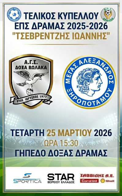 Η μεγάλη ώρα για το δραμινό ποδόσφαιρο έφτασε! Σήμερα, Τετάρτη 25 Μαρτίου στις 15:30, το ενδιαφέρον όλου του νομού στρέφεται στο Γήπεδο της Δόξας Δράμας, όπου θα διεξαχθεί ο 51ος Τελικός του Κυπέλλου Ερασιτεχνών «Ιωάννης Τσεβρεντζής» για την περίοδο 2025-2026.