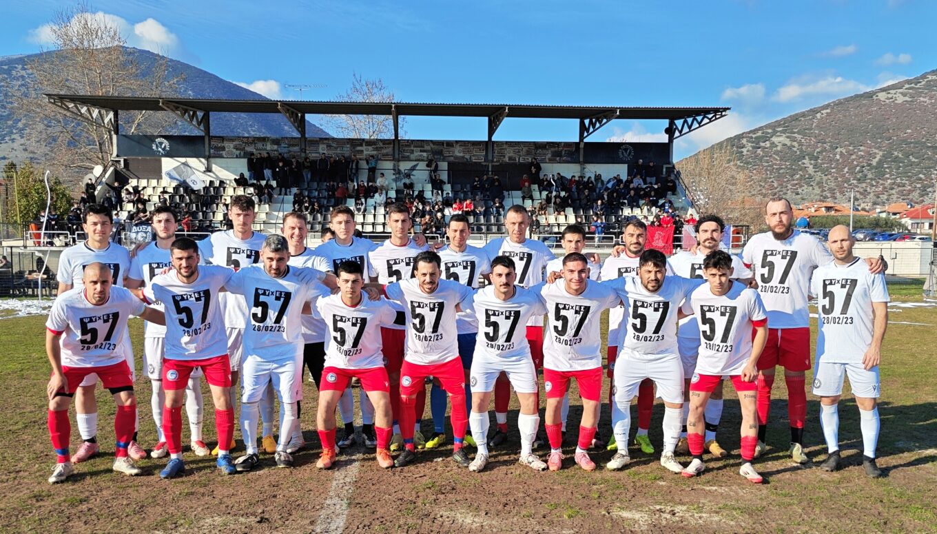 Πολύ ωραία εικόνα με την κοινή φωτογράφιση των δύο ομάδων πριν ξεκινήσει το παιχνίδι με κοινή ενδυμασία τα μπλουζάκια με το νούμερο 57, όσοι και οι νεκροί από την τραγωδία στα Τέμπη.